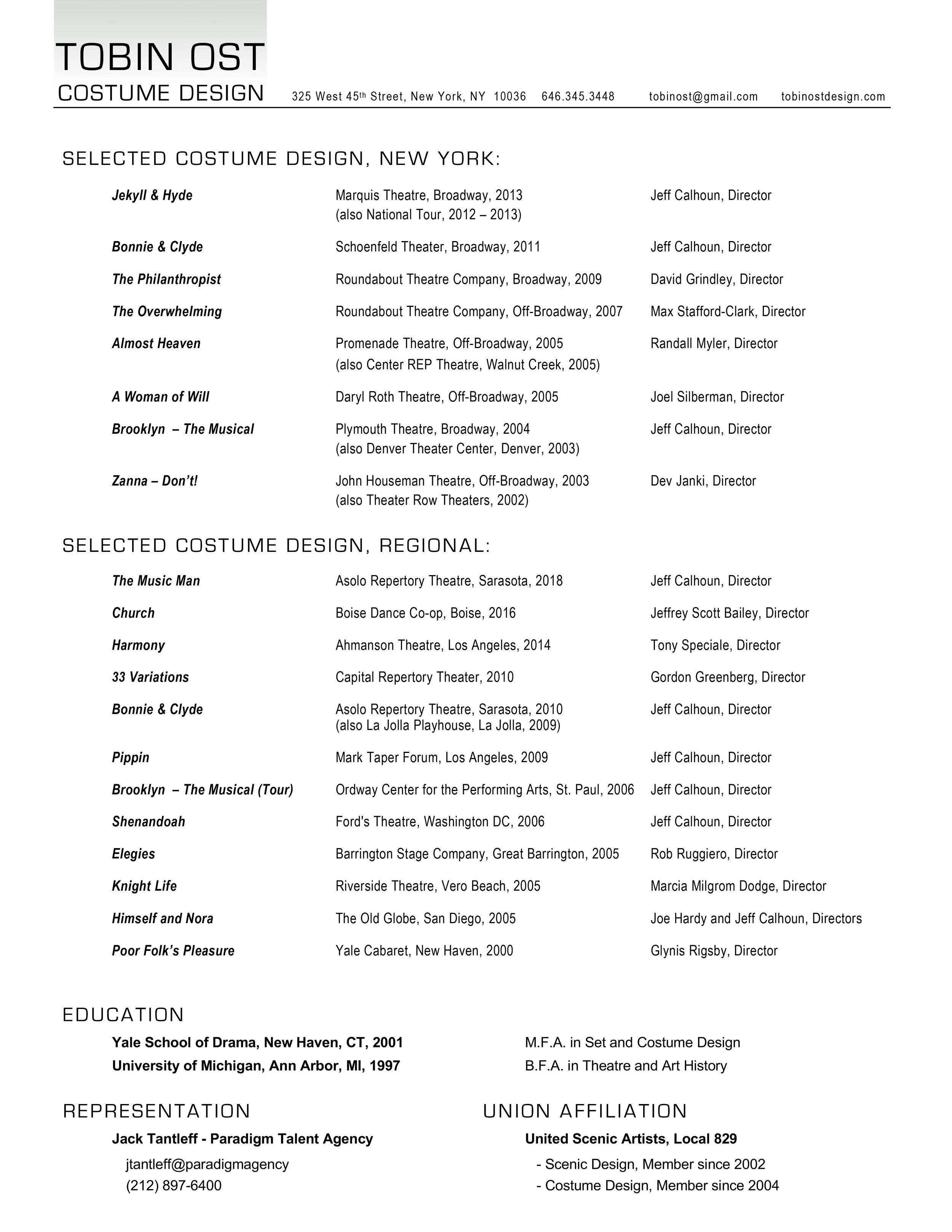 COSTUME DESIGN RESUME: