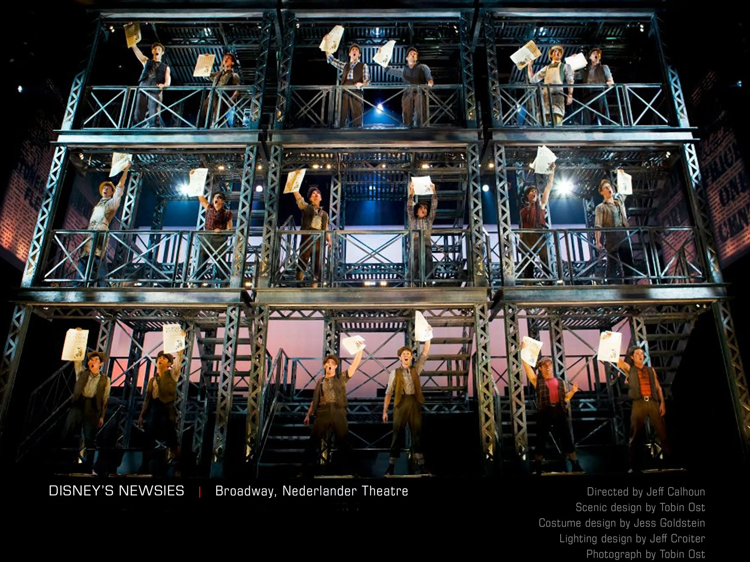 “Director Jeff Calhoun… ably handles the storytelling around Tobin Ost’s innovative set, which consists of three erector-set towers combined in different configurations.”